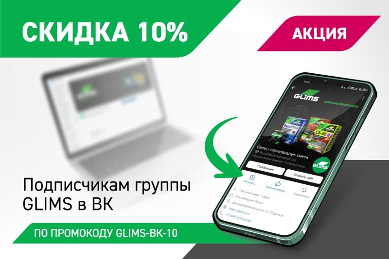 Подпишись на группу GLIMS ВКонтакте и получи скидку - 10%.