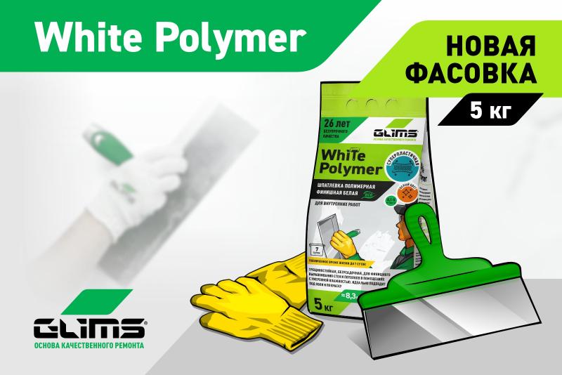 Шпатлёвка GLIMS WhitePolymer впервые была выпущена в упаковке весом 20 кг с расчётом на объёмные задачи, новая фасовка 5 кг рассчитана на проведение небольших ремонтных работ.