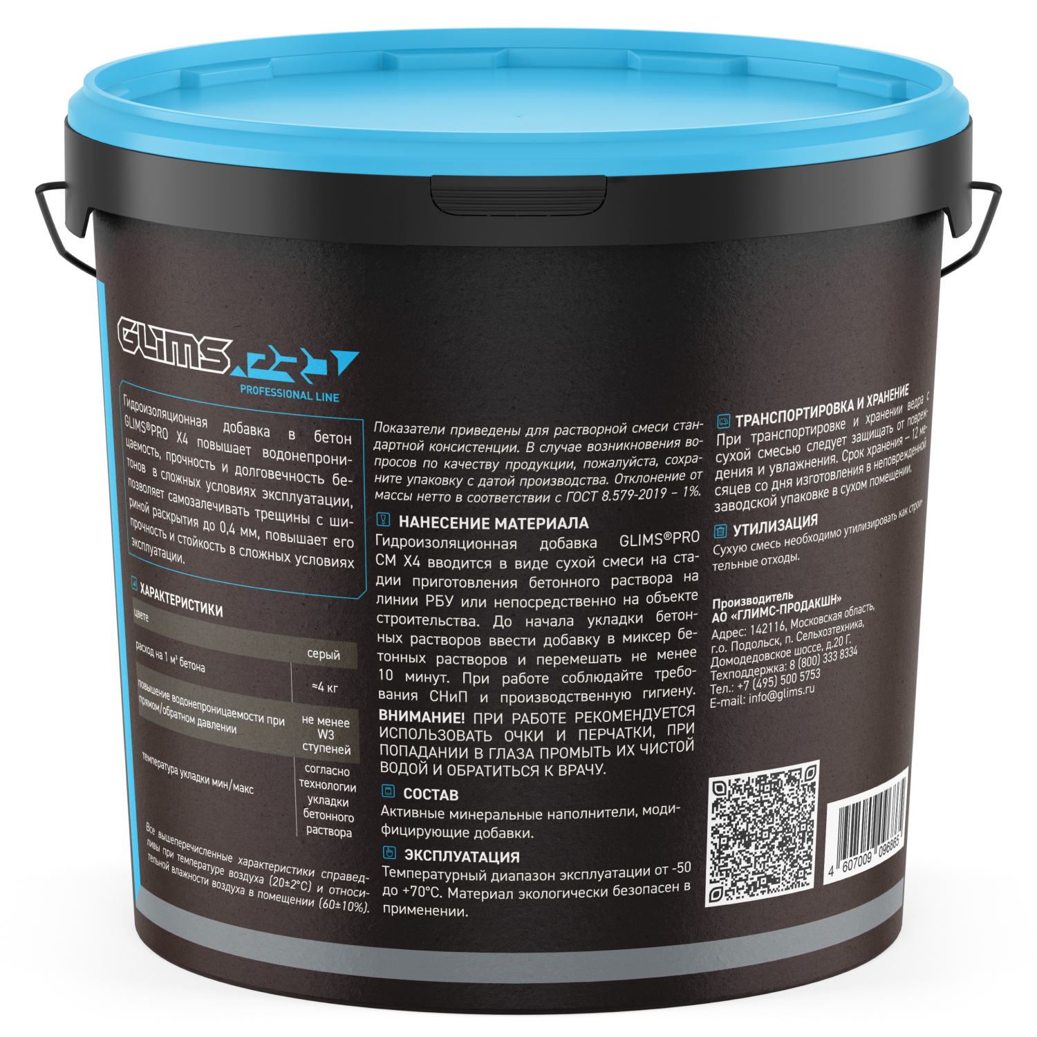 GLIMS®PRO X4 добавляется в бетонную смесь в количестве до 4 кг/м³. Совмещение GLIMS®PRO X4 с другими добавками возможно только после проведения лабораторных испытаний и получения положительного результата. При попадании материала на кожу или в глаза тщательно промойте чистой водой, при необходимости обратитесь к врачу.